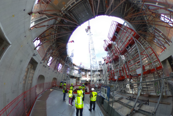 トカマク複合建屋の壁に近づきました。普段は頭上のクレーンが休む暇も無く、建設が進められていますが、今日は全ての工事を止めて、見学者を受け入れています。右手にあるのはコンクリートを流し込むためのパネルです。