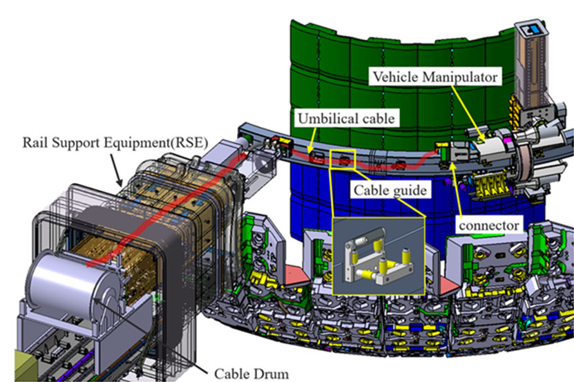 ブランケット遠隔保守システム(図2)は、ITER真空容器内で保守作業を行う大型マニュピレータのロボット装置です。ITER真空容器内は核融合で発生する中性子による真空容器内構造物の放射化により高い放射線環境にあり、人が中に入って作業することができないため、全て遠隔操作にて作業を行います。その遠隔保守装置に真空容器外から電源を供給し遠隔操作の信号を伝達する、約600芯からなる直径75mmの複合ケーブルを滞りなく送給する必要があります。