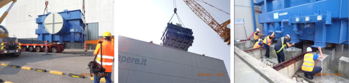 そこで、RFX研および現地工事を請け負うSynecom社と協議を行い、初期据付時よりも大型の500トンクレーンを使用し、高さ約25mの高電圧ホール建屋の屋上を経由して基礎上に下ろすという大掛かりな作業手順を選択しました。