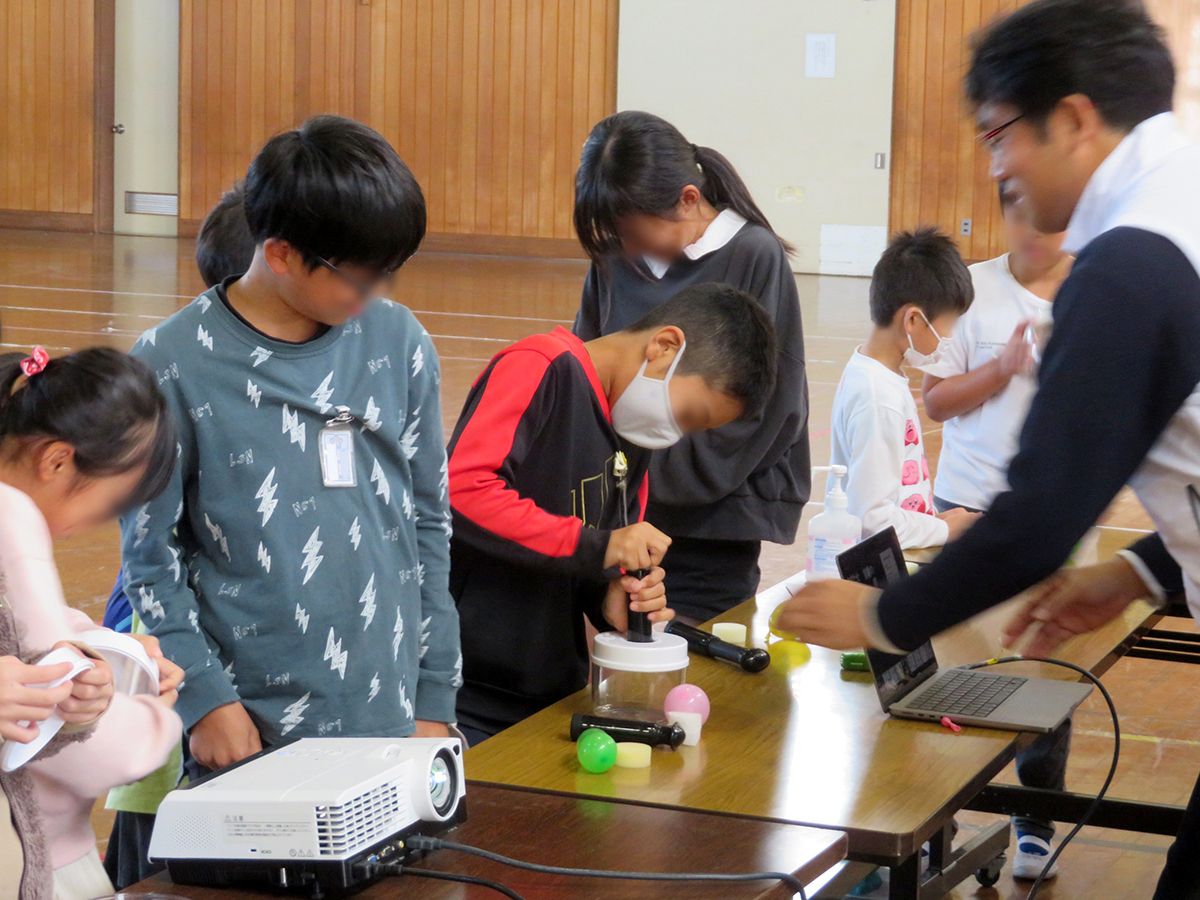 参加して下さった木崎小と芳野小2校の5年生、58人の児童の皆さんが4つのグループに分かれ、「トカマク博士の真空講座」「手作りイオン源」「偏光万華鏡」「太陽望遠鏡」の実験の観察や体験をしていただきました。