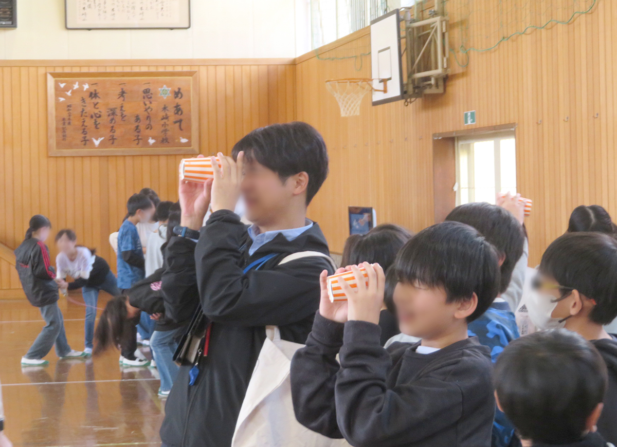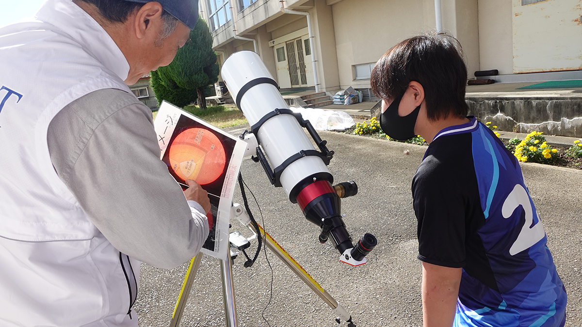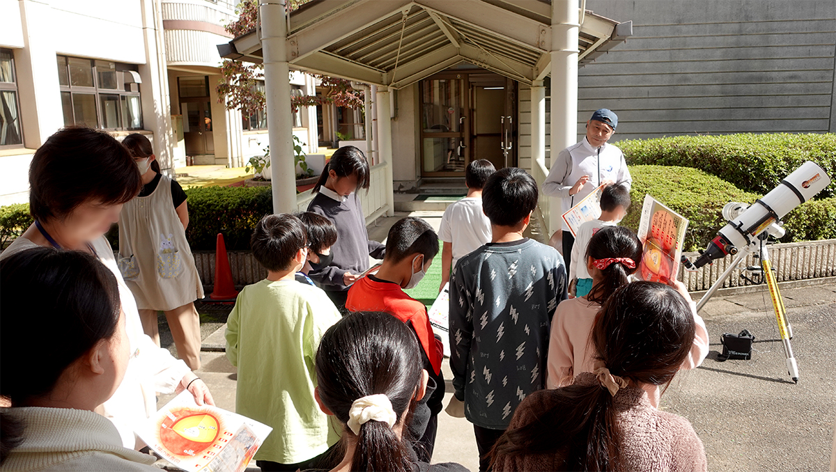 望遠鏡をのぞいた児童たちは「赤いもやもやが見える!」「これが太陽の炎なんだ!」と大興奮。別の児童は「太陽ってすごく遠いのに、こうして見えるのが不思議」と感想を話してくれました。科学的な観察を通して、身近な太陽への理解が一層深まったようでした。