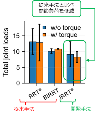 受賞の対象となった一連の開発では、既存のランダムサンプリングベースの動作生成手法をベースに、「障害物領域」と「関節負荷が過大となる領域」をサンプリング対象から除外することで、関節負荷の抑制と障害物回避を両立可能なロボット動作生成を効率的に行うアルゴリズムを実装しました。さらに既存手法と比較し、関節負荷が実際に抑制されることを確認しました(図2、3)。