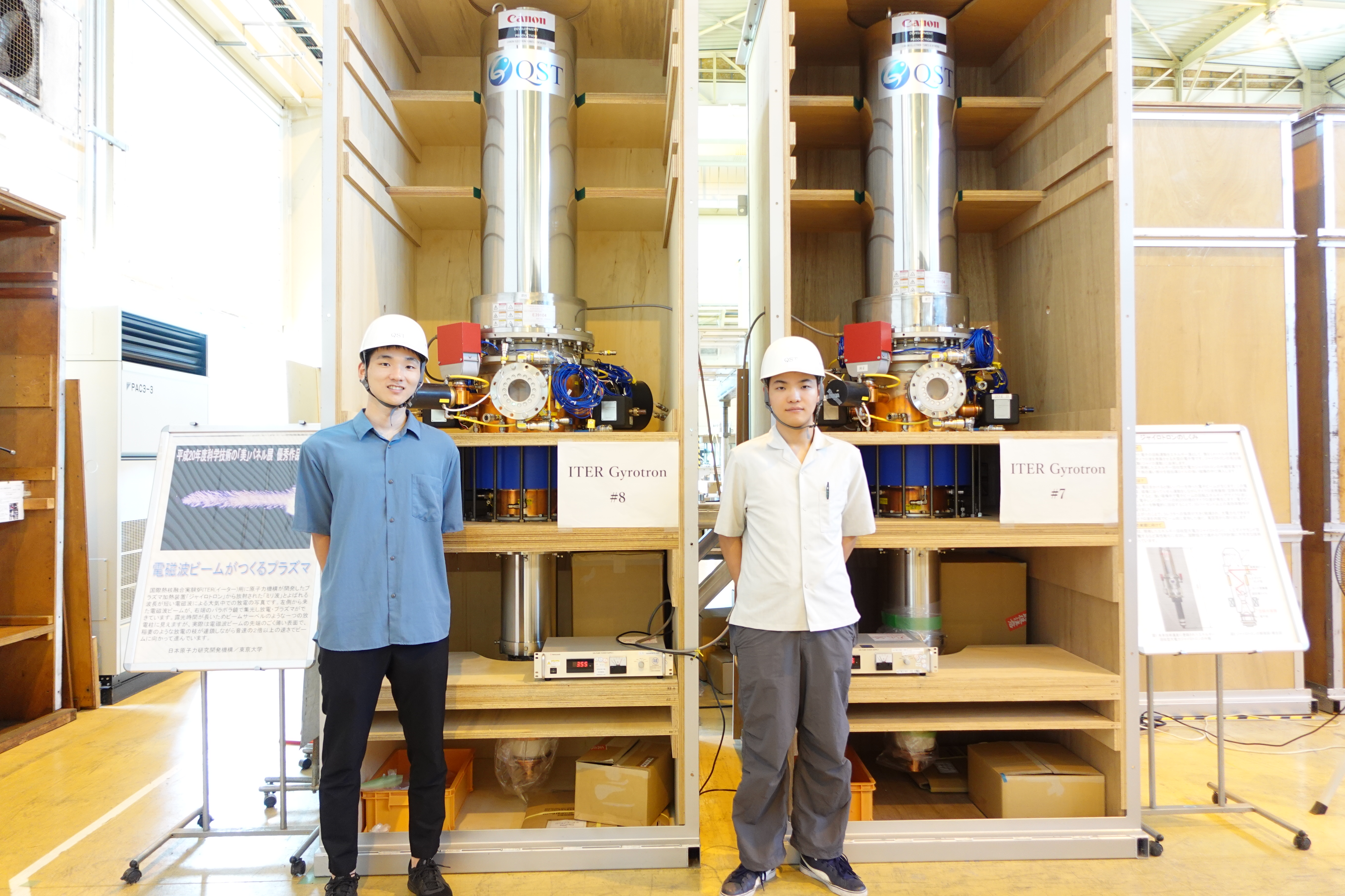 試験中のジャイロトロンの前で。実習生の中谷さん(左)、入江さん(右)
