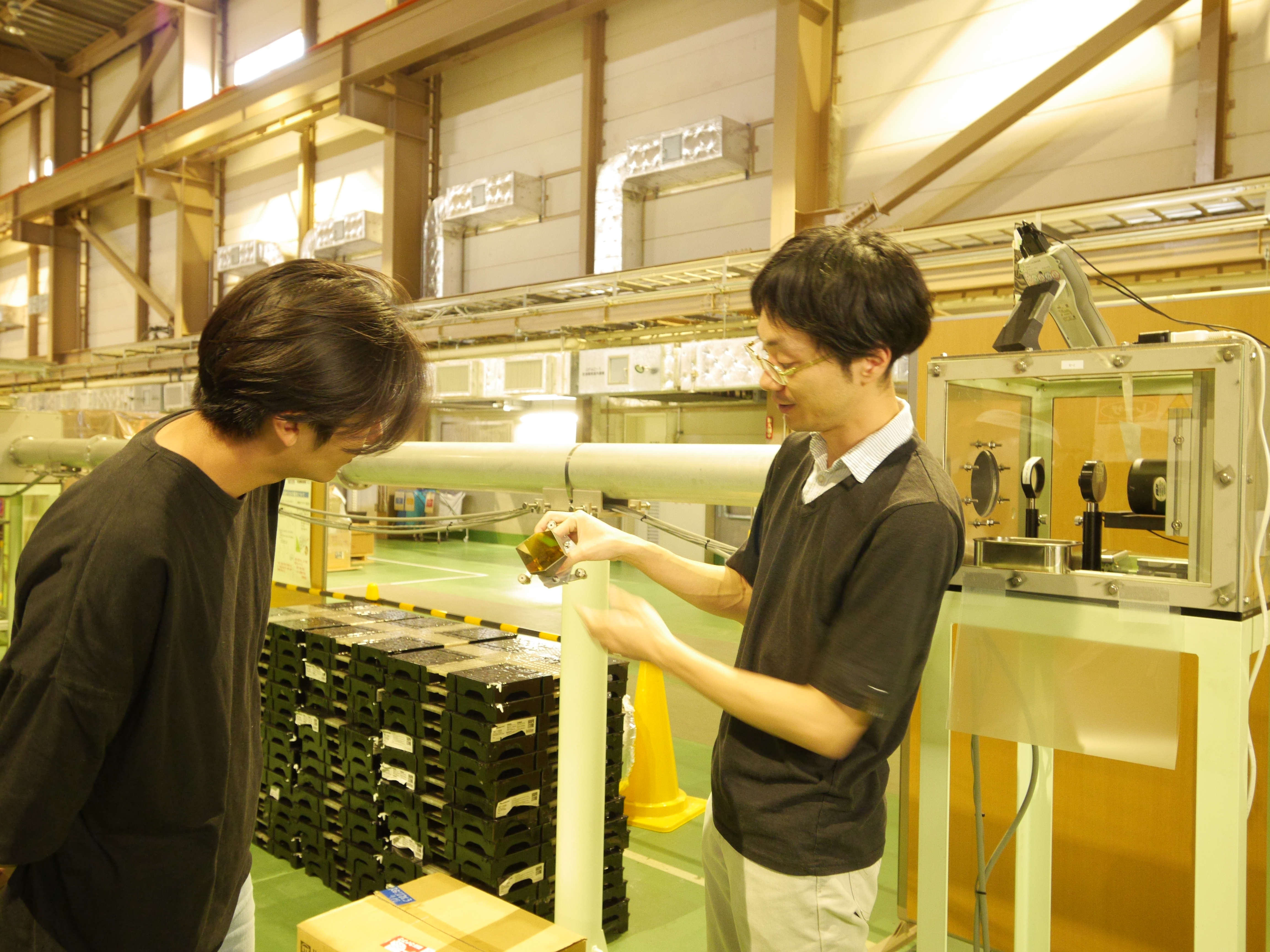 レトロリフレクターを覗き込む実習生の出村さん(左)と説明する神谷研究員(右)