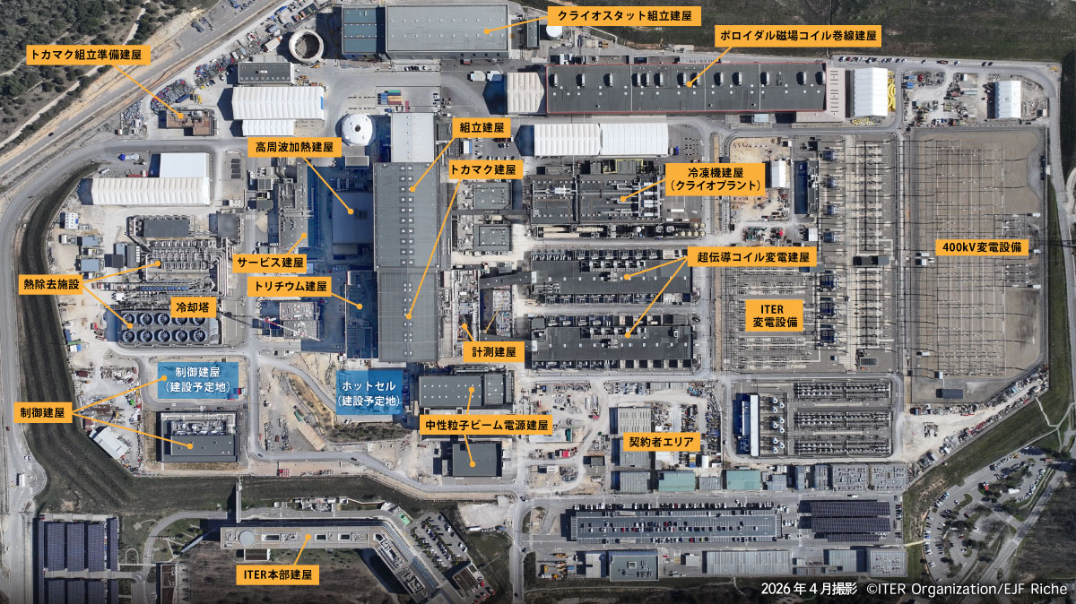 ITER建設サイトの180ヘクタールの広大な敷地の中には、42ヘクタールのITERプラットフォームがあり、ITERを建設するための複数の建屋が配置されています。ITER建設サイトでは、1,000人を越えるITER機構職員のほか、世界中から集まった、多くの技術者、研究者がITERを完成させ、エネルギーを作る研究をするために働いています。