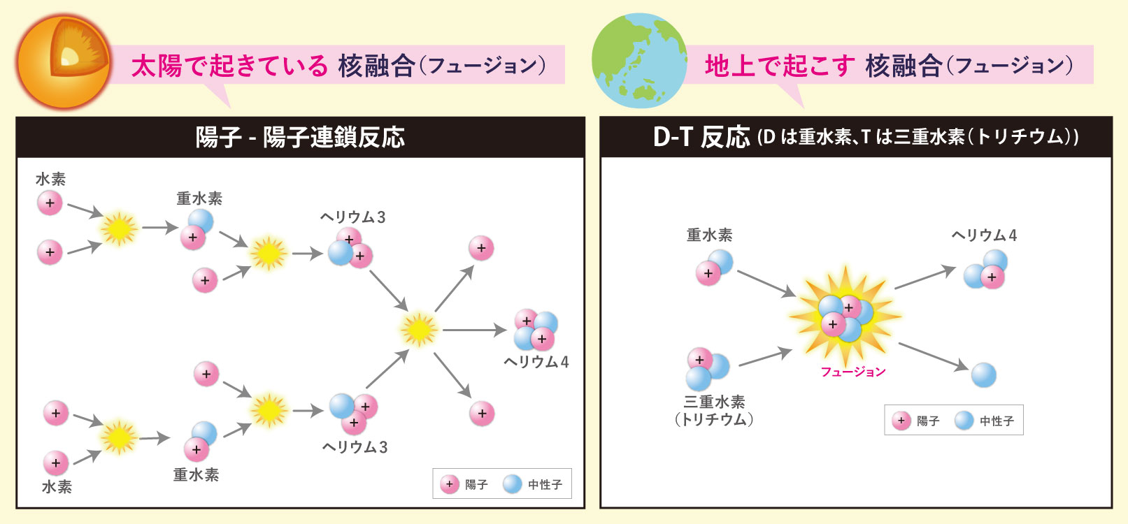 原子核同士をくっつけるには、プラスの電荷を持つ核同士の反発を超えるために、数億度もの超高温が必要になります。その状態の物質は「プラズマ」と呼ばれる、物質の第4の状態です。固体、液体、気体のどれでもなく、電気を帯びた粒子(イオンと電子)が自由に動き回る状態です。蛍光灯の光やオーロラ、そして太陽も、すべてプラズマなんですよ。