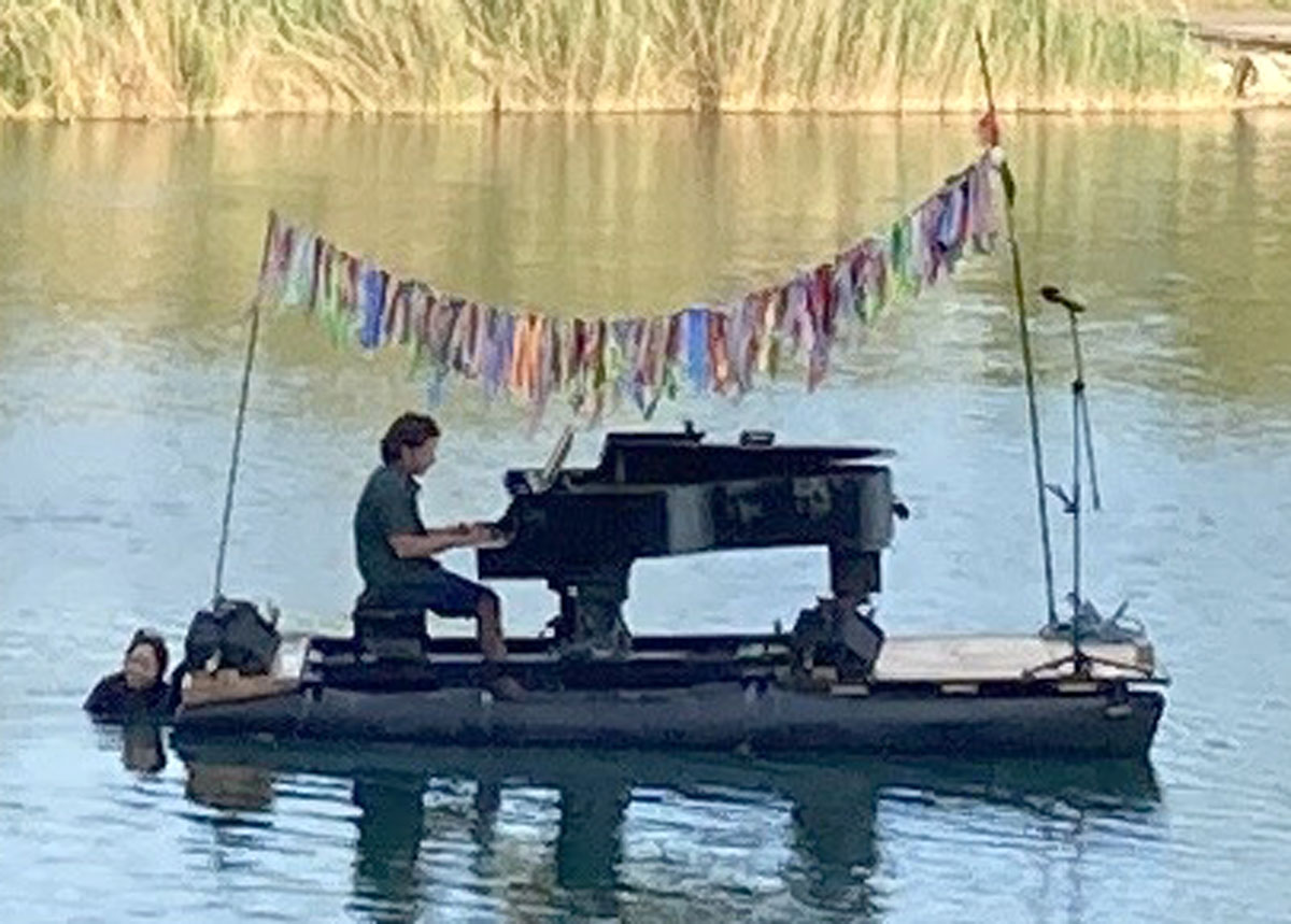 実は、ピアノ奏者が乗っかっている筏をウエットスーツを着た女性が押して、湖の上を右に行ったり、左に行ったりしていました(た、大変…!!)。