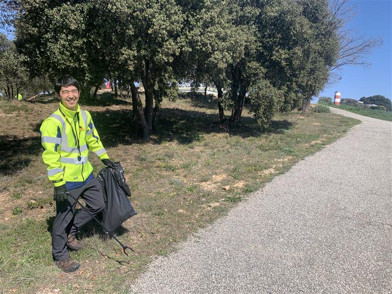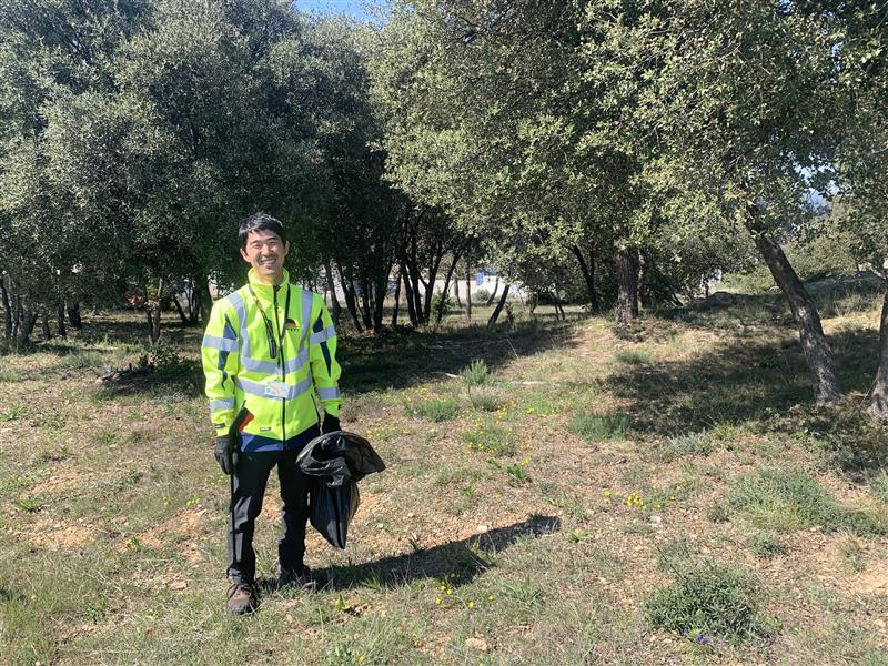 昼休みの間に行われた構内クリーンアップ作戦の様子。ITER機構日本人職員のKさんを発見!