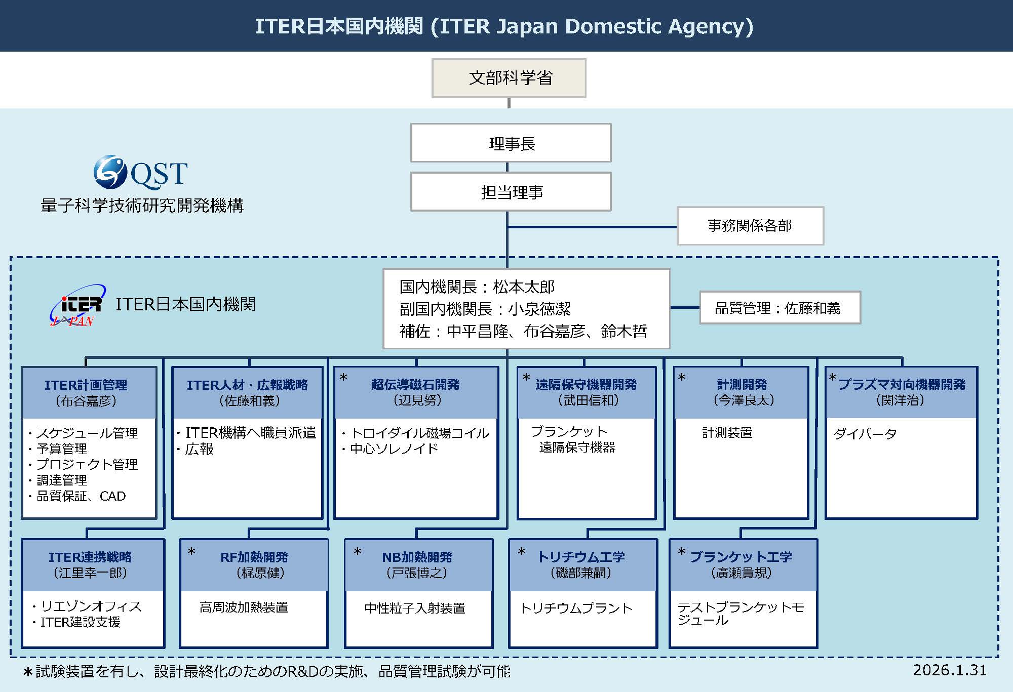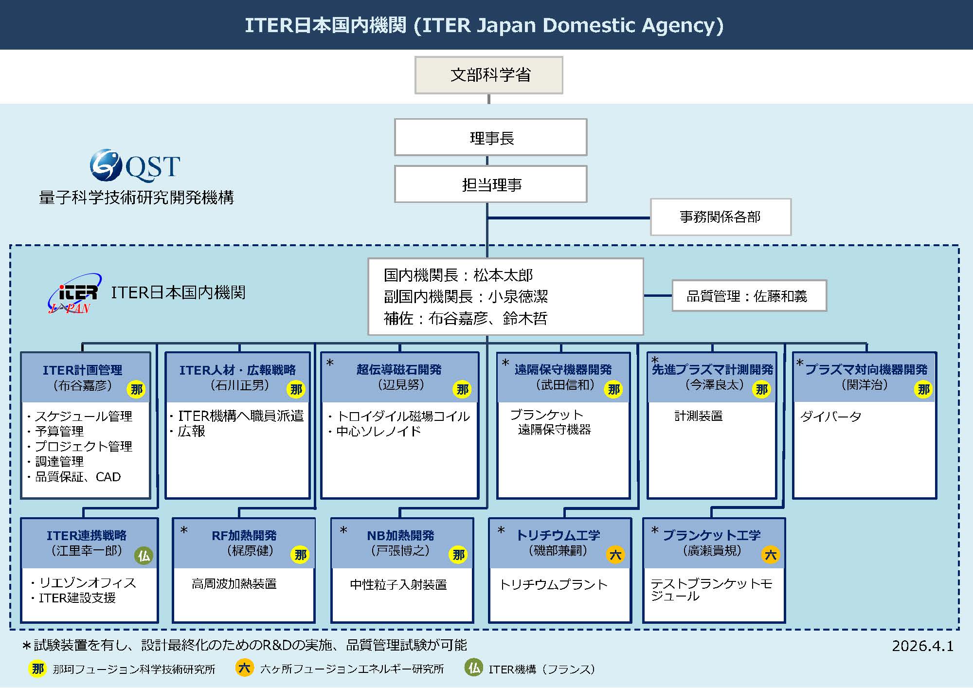 ITER計画ではITERに参加する加盟極に国内機関を設置しています。 量子科学技術研究開発機構はITER日本国内機関(ITER Japan Domestic Agency, JADA)として日本政府から指定を受け、ITERに必要な超伝導コイルなどの機器(装置)の調達・ITER建設サイトへの物納およびITER機構でプロジェクトに参加する人材の派遣を行っています。