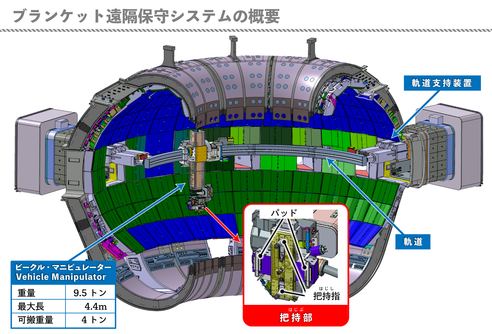 ITER機器のうち、真空容器内機器については遠隔による保守が可能な構造であることが設計条件の一つになっています。そして、真空容器内機器のうち二種類の機器、ブランケットとダイバータが主な保守対象となっています。ブランケットは、中性子遮蔽などの機能を持ち、真空容器内表面のほぼ全域を覆っています。ダイバータは、真空容器の下部に位置している不純物の制御を行うための機器です。この二種類の機器は、保守を容易にするために小部分に分割されていて、それぞれブランケットモジュール、ダイバータカセットと呼ばれています。どちらも定期交換が必要な遠隔保守クラス1とされていて、一定の頻度で定期交換を予定している他、不定期の交換にも対応することとなっています。どちらも遠隔保守用に専用のシステムが準備されていて、ブランケットに関しては日本が、ダイバータについては欧州連合(EU)が遠隔保守システムを調達します。